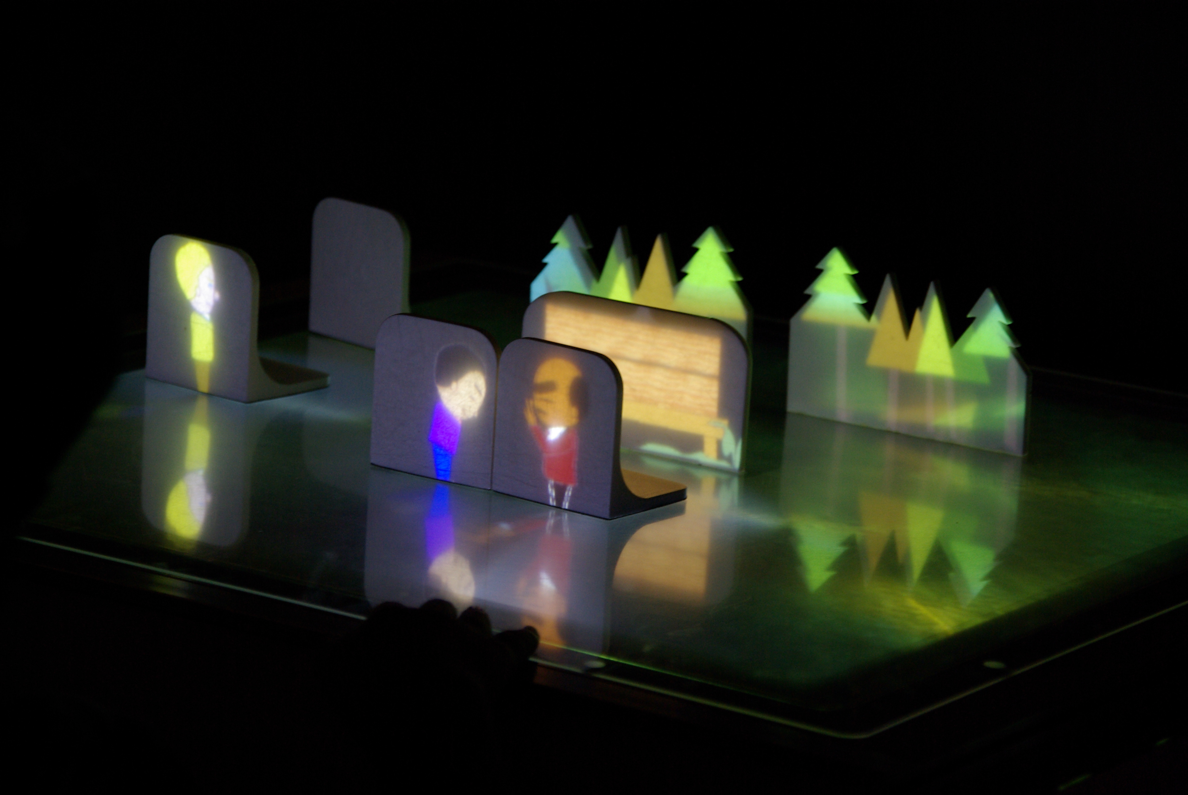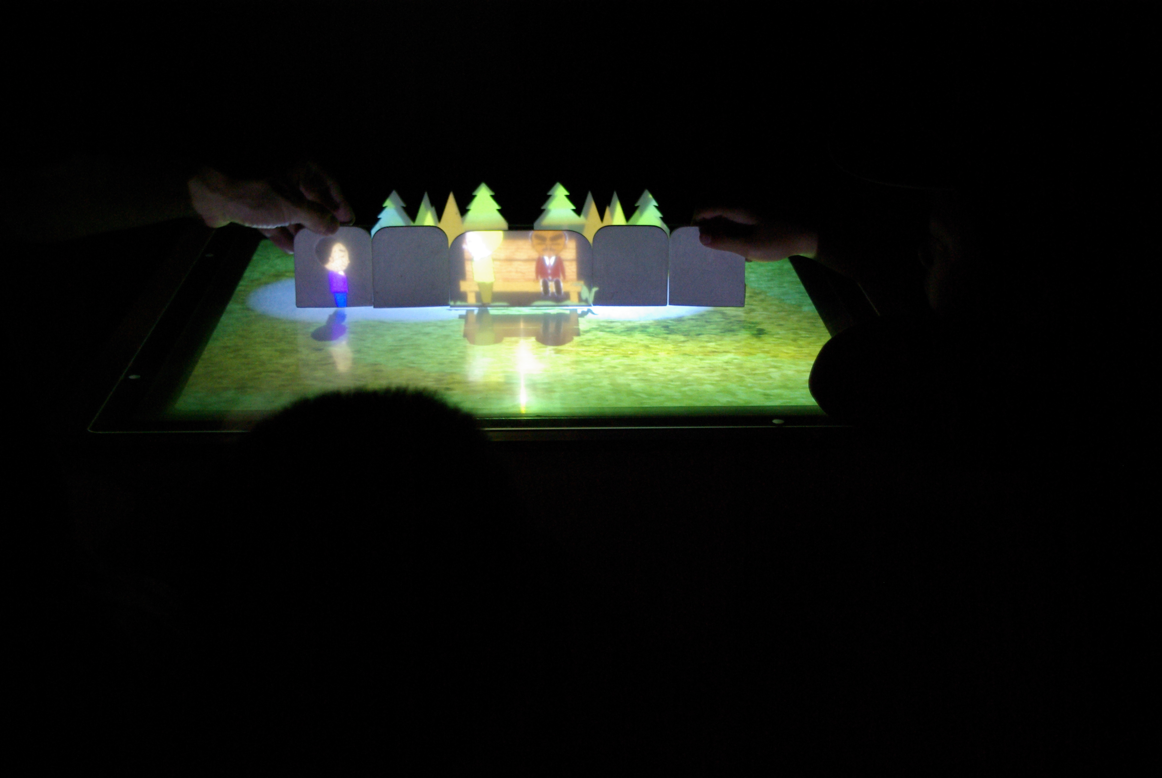 テーブルに置かれたコマの中に、いろいろな人が映っています。