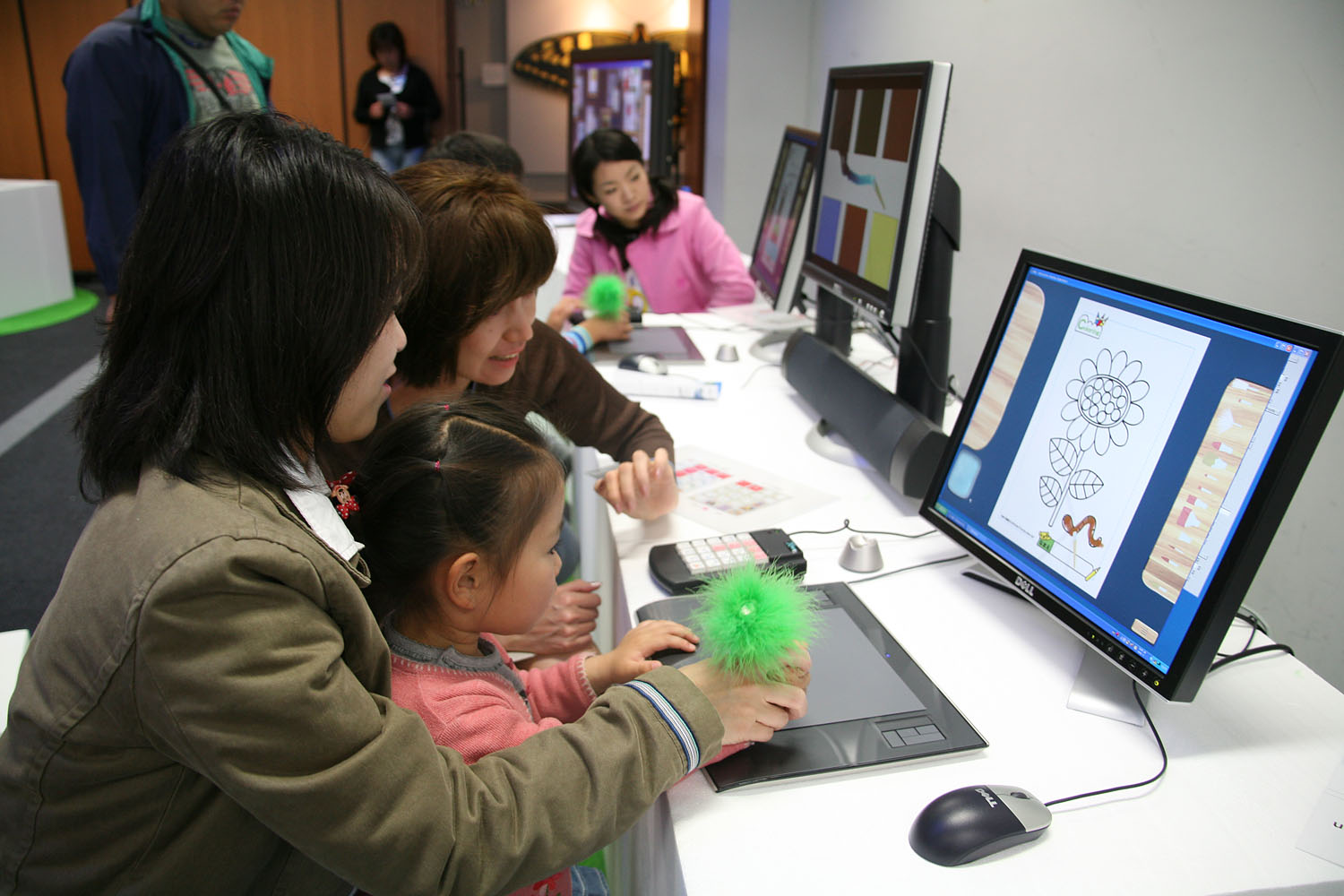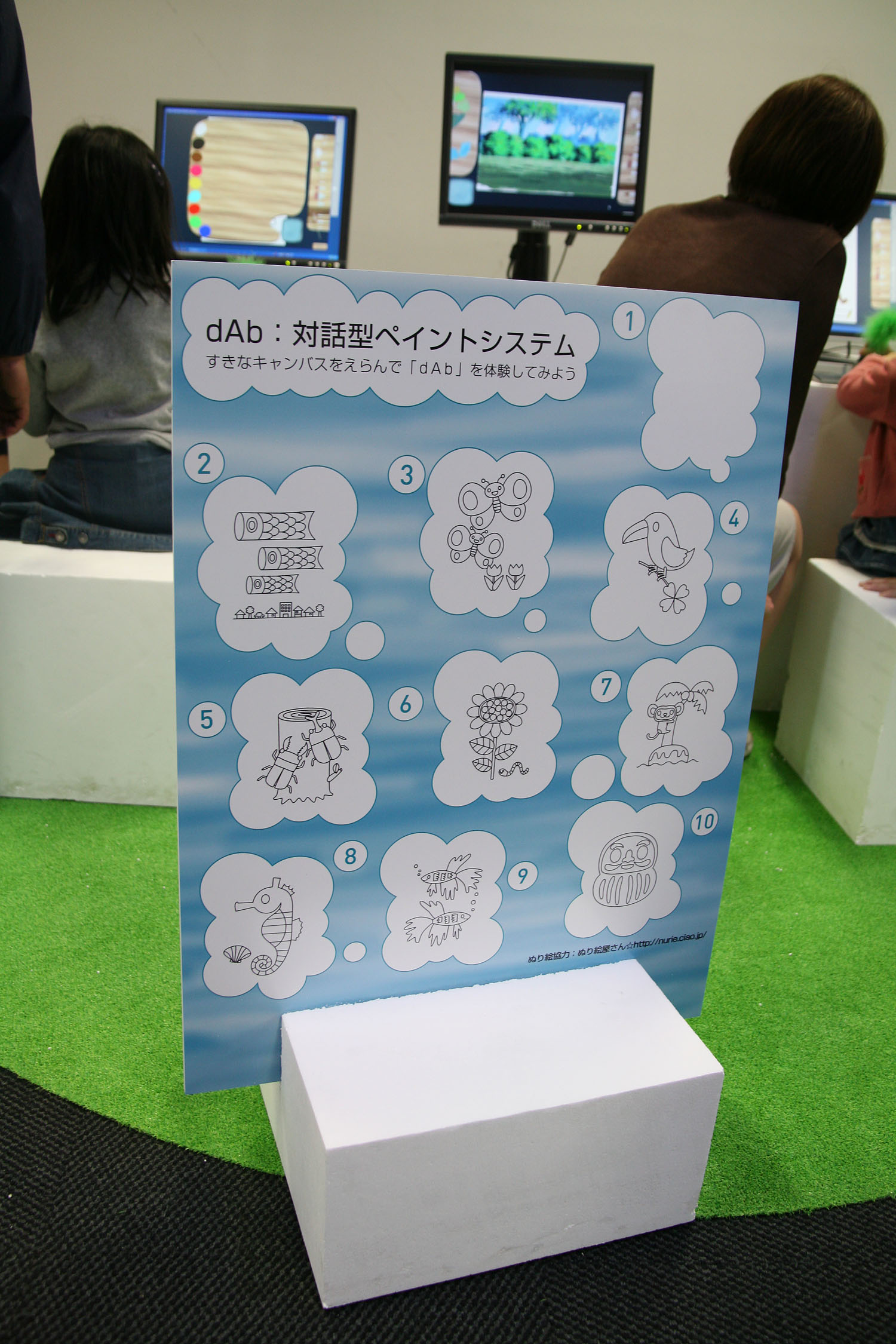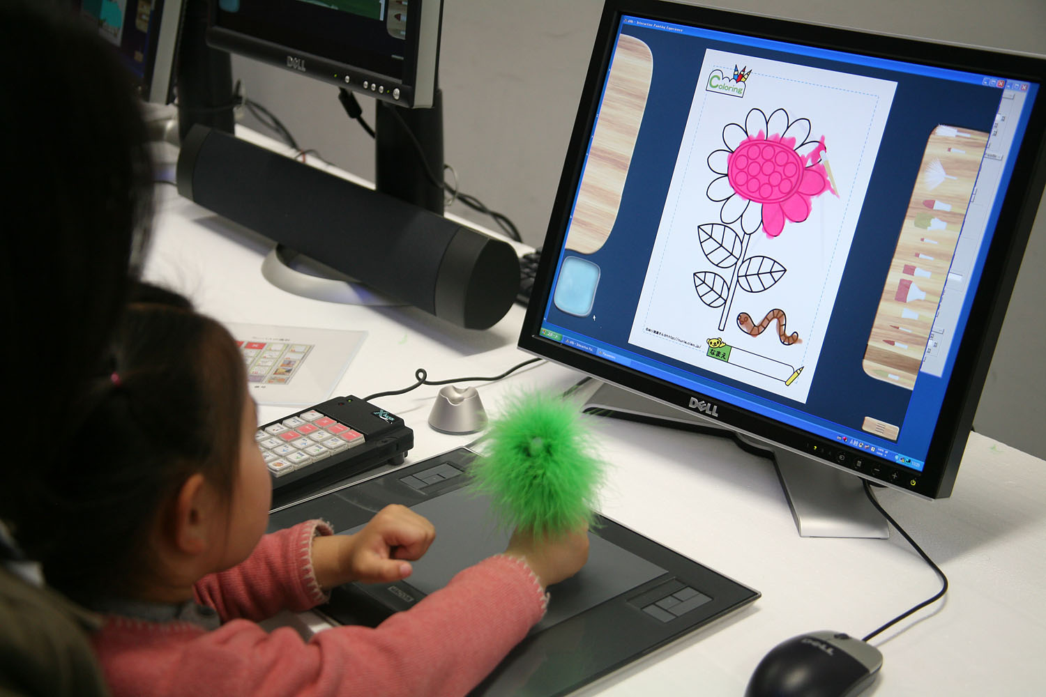 画面上に現れる絵筆で お絵かきやぬりえをします。 色んな種類の筆を使って、 パレットで絵の具を混ぜたり、 水で溶いたり、 本物みたいな感覚で描けます。